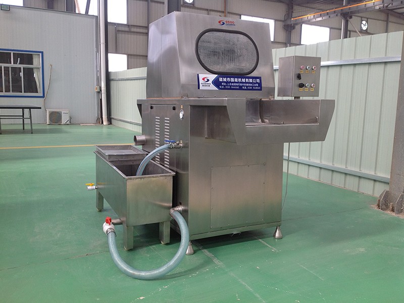 本機(jī)可將鹽水及輔料配制的腌漬均勻地注射到肉塊中,縮短了腌漬時(shí)間,大大提高了肉制品的口味及出口率??筛鶕?jù)工藝師要求調(diào)節(jié)注射壓力,腌漬劑均勻連續(xù)入肉中,達(dá)到理想的注射效果。本機(jī)設(shè)計(jì)嚴(yán)謹(jǐn)、結(jié)構(gòu)合理、操作簡便,設(shè)有自動(dòng)保護(hù)裝置,當(dāng)注射針碰到硬物時(shí)注射針隨之抬起,不受損壞,是肉制品加工過程中的理想設(shè)備。