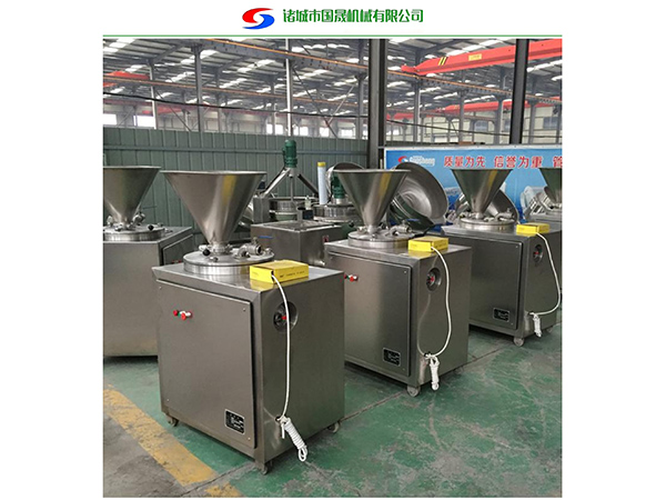 本機(jī)適合灌制各種香腸,紅腸,臘腸,烤腸,以及糊狀,塊狀火腿肉食制品,豆制品。本機(jī)優(yōu)點(diǎn)是采用大齒輪,大動(dòng)力,可灌制大肉塊火腿。本機(jī)操作簡單。效率高,易清洗,與灌裝物接觸部分全部采用國家衛(wèi)生部許可的sus304不銹鋼材料制作,符合衛(wèi)生標(biāo)準(zhǔn). 液壓灌腸機(jī) 液壓灌腸機(jī)是加工腸類制品的設(shè)備。能灌制大、中、小各種規(guī)格的腸制品。該產(chǎn)品外形美觀、做工精良、操作方便、使用安全可靠。該機(jī)的料斗、閥門、灌腸管及整機(jī)外包裝均采用不銹鋼制造。符合食品衛(wèi)生要求。雙層控制開關(guān),除手動(dòng)開關(guān)外還有腳踏開關(guān),在灌裝的過程中可以減少繁瑣的操作。 氣動(dòng)定量扭結(jié)灌腸機(jī) 氣動(dòng)定量扭結(jié)灌腸機(jī),采用先進(jìn)技術(shù)運(yùn)用氣動(dòng)、光電控制原理,可連續(xù)自動(dòng)定量灌裝扭結(jié),適合灌裝各種、火腿類產(chǎn)品,適合天然腸衣、膠原、煙熏腸衣。此機(jī)體積小,投入低,適用于中、小型肉制品加工企業(yè)。改變了以往灌腸機(jī)只灌腸,不能自動(dòng)扭結(jié)的現(xiàn)狀。設(shè)備外形美觀。小巧玲瓏,與肉食接觸部分及外包裝全部采用不銹鋼制造。操作簡單,易于清冼,定量準(zhǔn)確,誤差小。真空灌腸機(jī) 真空灌腸機(jī)是集定量灌裝、高速扭結(jié)于一身的真空灌裝機(jī),速度可根據(jù)產(chǎn)品和原料不同可無級調(diào)整。 。在真空狀態(tài)下完成灌裝過程,有效的防治脂肪氧化,避免蛋白水解,減少細(xì) 菌存活量,有效的保證產(chǎn)品的保質(zhì)期和產(chǎn)品的顏色鮮亮、味道純正,是國內(nèi)外灌裝機(jī)械中的高端的產(chǎn)品,實(shí)現(xiàn)自動(dòng)化生產(chǎn)。