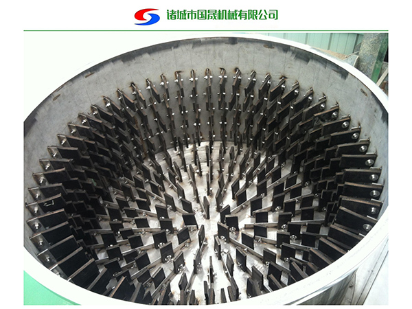 該機(jī)用于豬蹄、豬耳、豬鼻等去毛后的去黃皮、黑皮的工作和去除附著在表面余毛雜物等工作。本機(jī)通過減速機(jī)帶動(dòng)甩盤轉(zhuǎn)動(dòng),使物料在筒內(nèi)高速旋轉(zhuǎn)碰撞、摩擦,從而實(shí)現(xiàn)脫黑皮和打毛的要求。